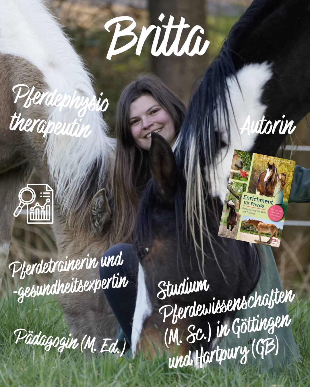 Gründerin von Kleine Tante ist Britta, Pferdephysiotherapeutin, Trainerin und Pferdeexpertin. Nach der Ausbildung zur Pferdephysiotherapeutin beim DIPO hat sie in Göttingen und an der Hartpury University in England Pferdewissenschaften studiert. Außerdem ist sie Pferdefutterberaterin, Fitnesstrainerin für Menschen und hat einen Masterabschluss als Pädagogin. Mit „Enrichment für Pferde“ erscheint 2026 ihr erstes Buch.