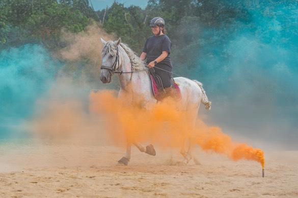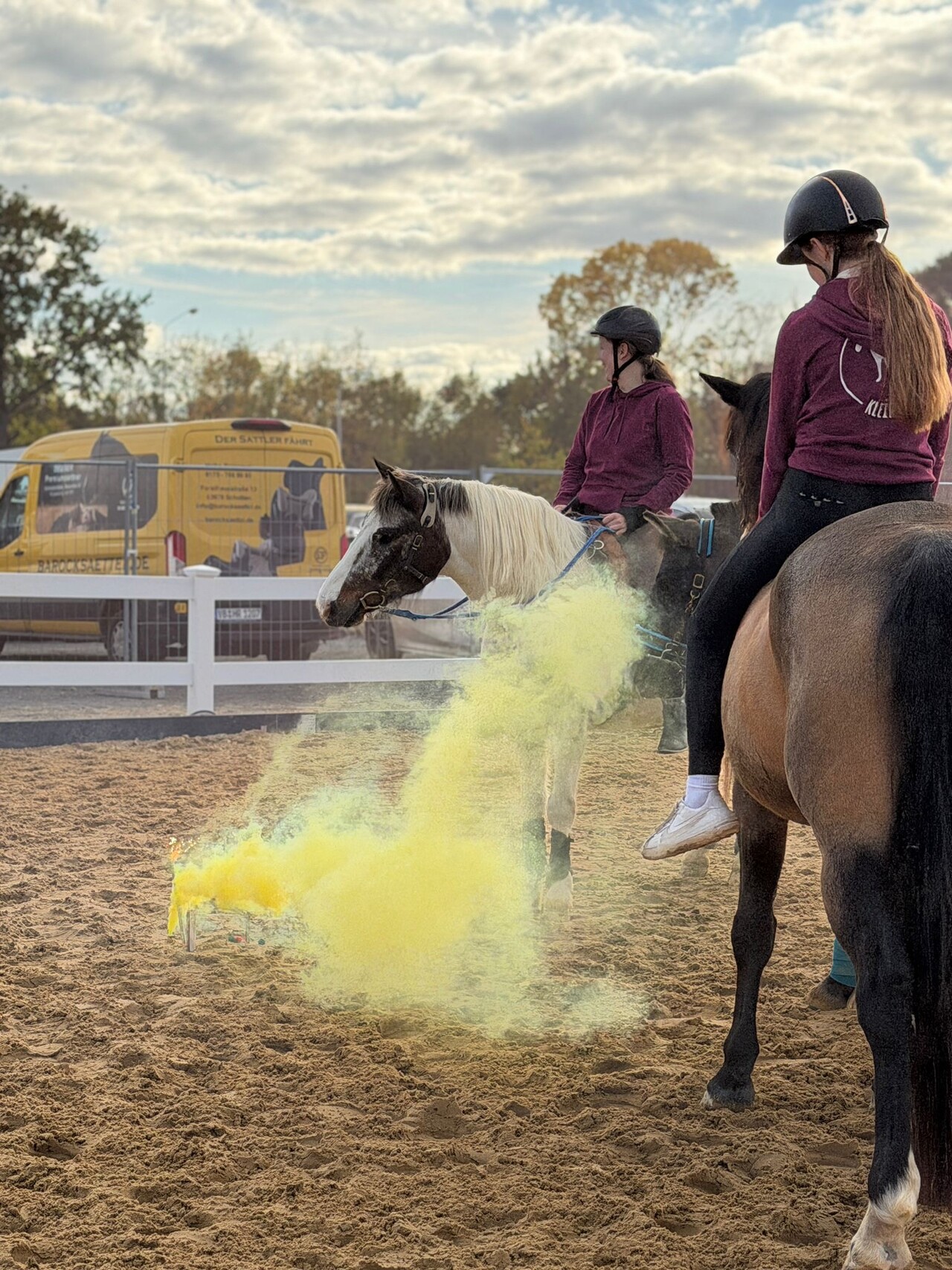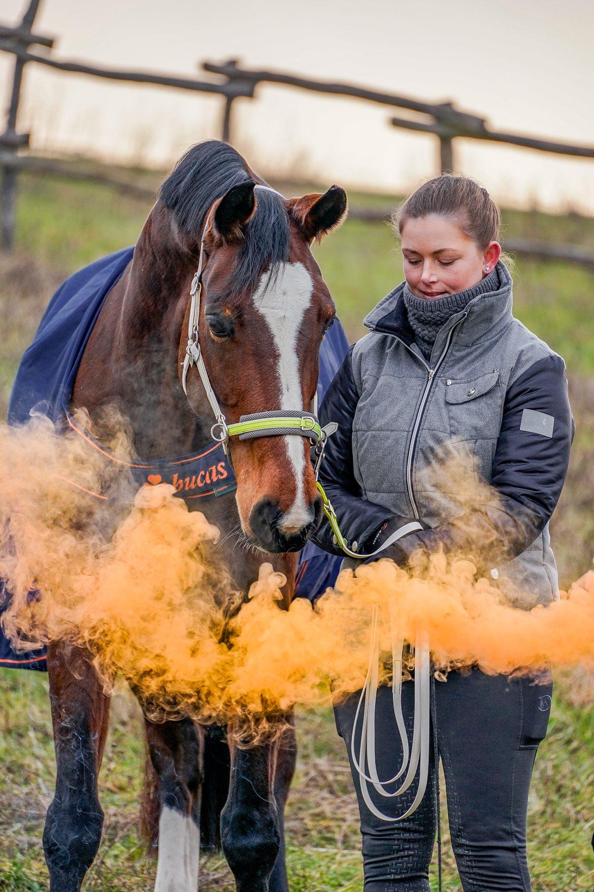 Geht gemeinsam durch Funken und Rauch - bei unserem Pyrotechnik-Tageskurs für alle neugierigen Pferde-Mensch-Teams. Schritt für Schritt nähern wir uns, jeder in seinem Tempo, den pyrotechnischen Elementen. Die Pferde sind erfahrungsgemäß sehr neugierig und motiviert dabei - Funken und Farbrauch aus nächster Nähe sind für sie etwas völlig Neues, sodass sie aufgeschlossen darauf zugehen. Unser Ziel ist es, dass Pferd und Mensch sich gemeinsam aktiv mit den Elementen auseinandersetzen, einander in einer ganz neuen Situation kennenlernen, fein kommunizieren, ihr gegenseitiges Vertrauen stärken, den Kopf fordern und einfach Spaß miteinander haben! Pferde und Menschen können nach diesem ereignisreichen und lehrreichen Tag am Abend immer besonders gut schlafen 😉